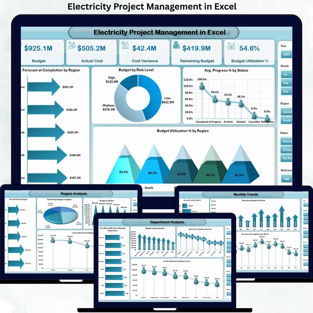 Electricity Project Management in Excel This ready-to-use Excel dashboard converts complex electricity project data into clear KPIs, interactive visuals, and decision-ready insights. Instead of tracking budgets, costs, risks, and progress across multiple files, project managers and leadership teams get one centralized Excel dashboard that shows exactly where projects stand, where risks exist, and what actions are required. As a result, teams move from reactive firefighting to proactive project control.