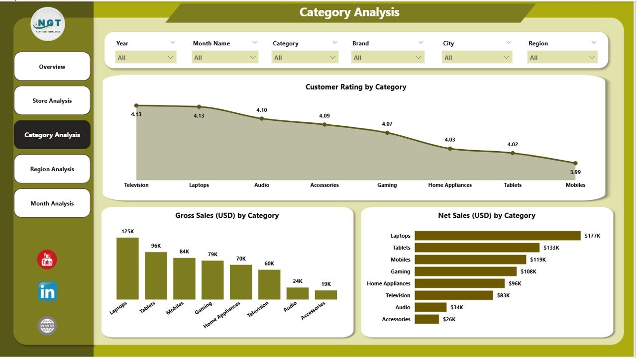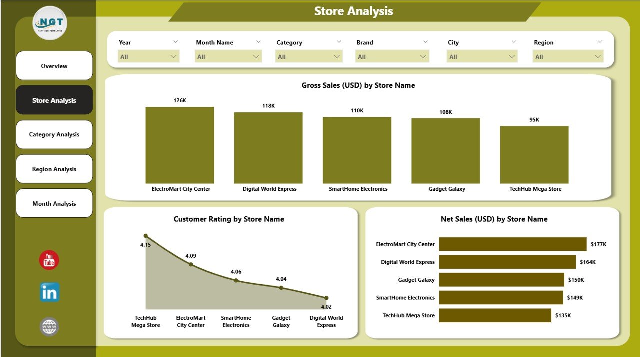 🏬 Store Analysis Page – Compare store-wise sales, customer ratings, and net sales to identify top and low performers.
