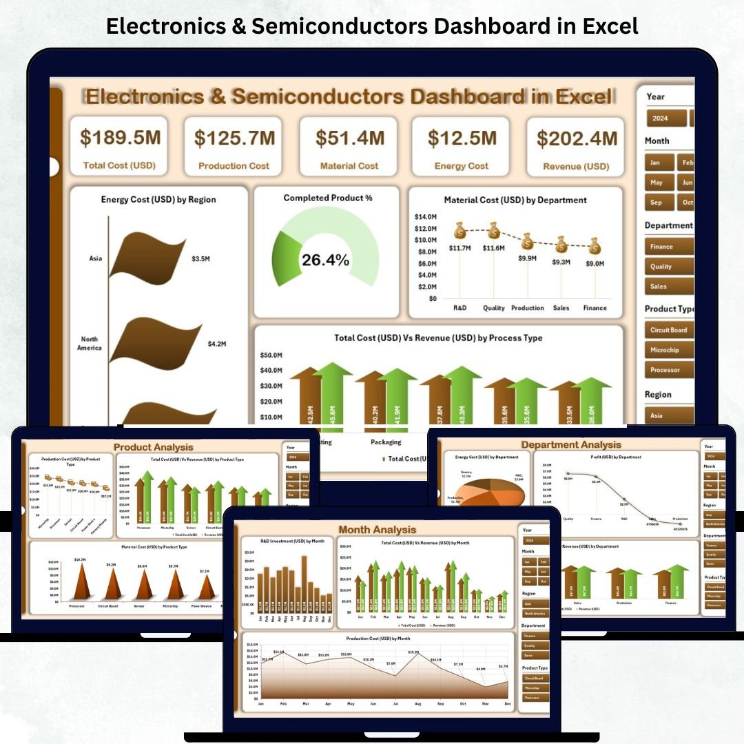 The Electronics & Semiconductors Dashboard in Excel is a ready-to-use business intelligence tool that empowers manufacturers, analysts, and managers to visualize performance, monitor costs, and drive efficiency — all within Microsoft Excel.