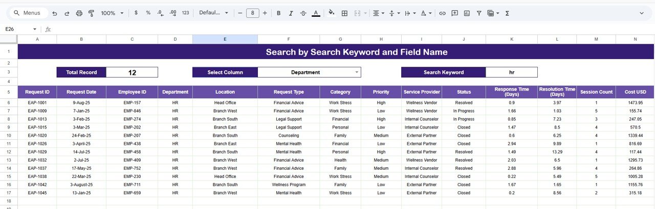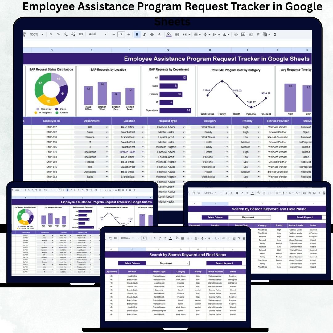 The Employee Assistance Program Request Tracker in Google Sheets is a ready-to-use, professional solution designed to manage EAP requests with clarity, care, and control. This tracker helps HR teams record requests, prioritize urgent cases, track response time, monitor satisfaction, analyze costs, and identify trends—without complex HR software.