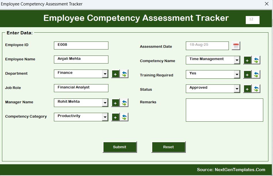 📝 Automated Data Entry Forms – Easily add, update, or delete competency assessment records using VBA-powered forms.