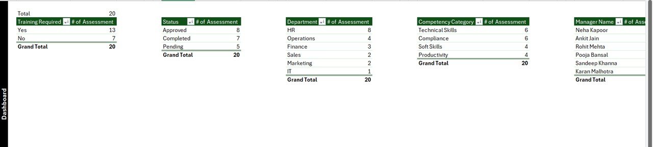 📊 Interactive Competency Dashboard – Visual charts and slicers provide insights into competency performance across departments and managers.
