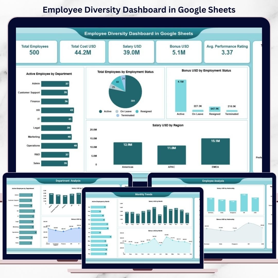This ready-to-use dashboard transforms raw employee data into a structured, visual, and insight-driven reporting system. It allows HR teams, DEI leaders, finance teams, and executives to analyze workforce diversity, compensation, performance, and cost trends across departments, regions, employment types, and nationalities—all from one interactive Google Sheets dashboard.