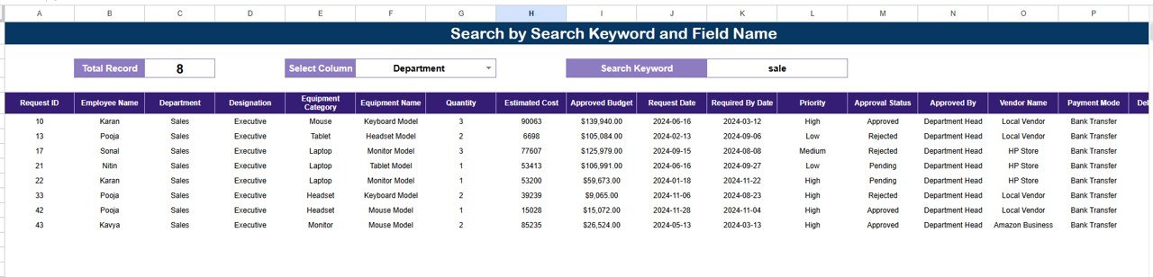 This ready-to-use tracker provides a structured and centralized system to manage all employee equipment purchase requests in one place. It records request details, tracks approval status, analyzes department-wise demand, monitors vendors, and delivers instant insights through visual charts and a powerful search feature.