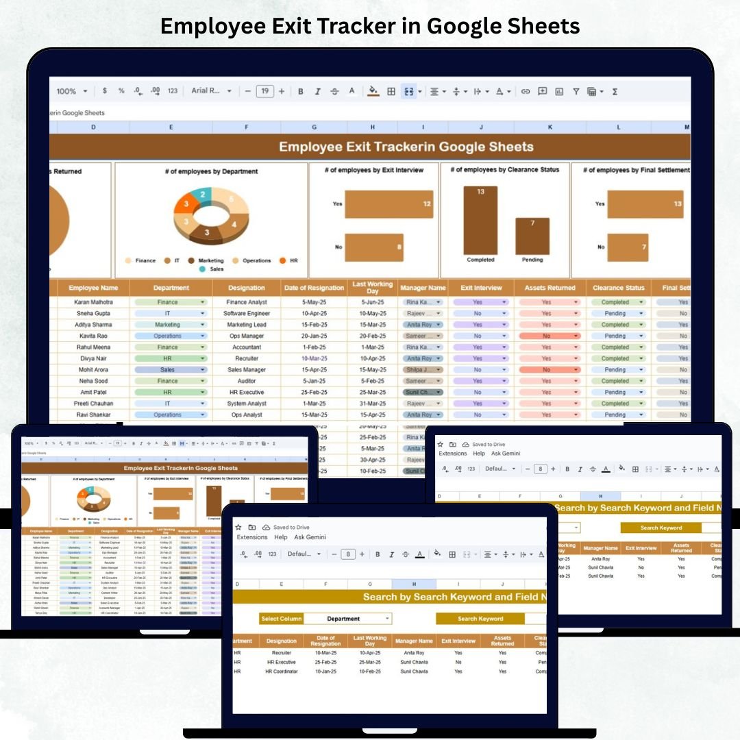 This comprehensive tracker consolidates all exit activities in one place, offering visual dashboards, automated summaries, and collaborative tracking. Designed for HR professionals, it simplifies offboarding, reduces administrative errors, and saves valuable time — all within the familiar Google Sheets environment. 📊