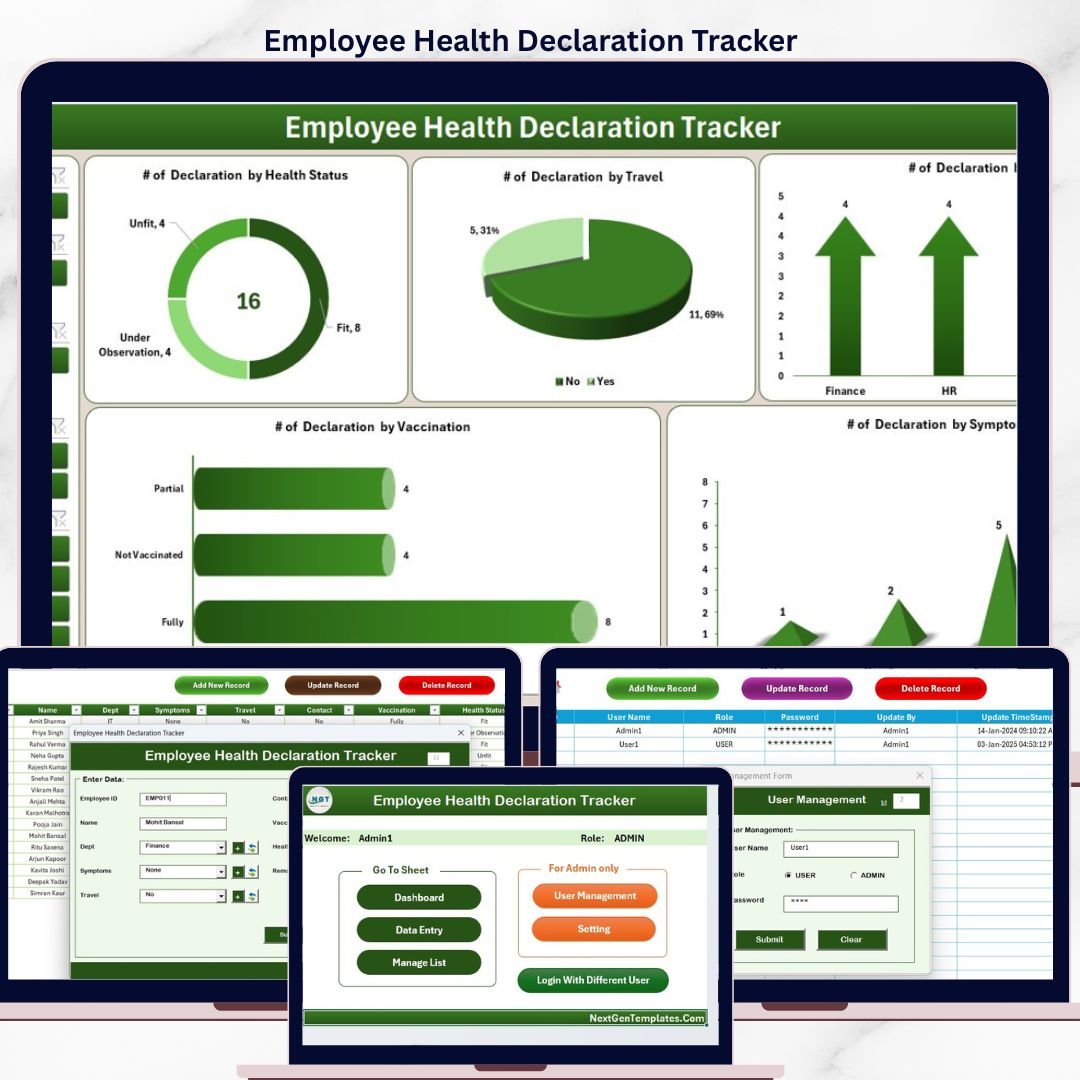The Employee Health Declaration Tracker in Excel captures structured workplace health-status submissions across 8 purpose-built worksheets, with a password-protected Login Form, a VBA-powered Data Entry form (Add / Update / Delete), a Dashboard page with 4 slicers and 5 auto-refreshing charts, plus a dedicated User Management sheet. Replace the sample declarations and every KPI, chart, and filter updates in under 10 minutes.