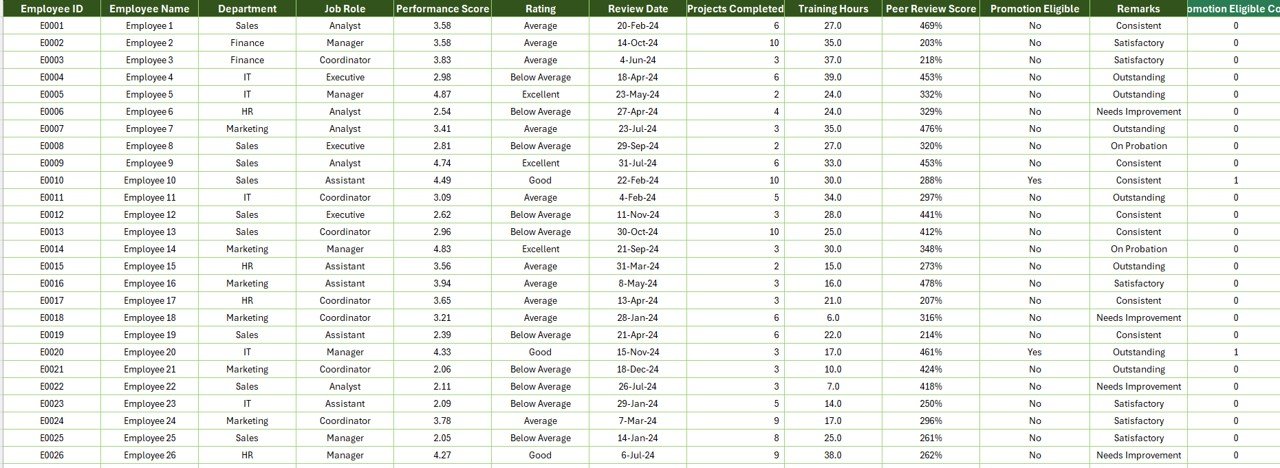 🚀 Step 1: Input all employee details (ID, Name, Department, Role, Rating, etc.) in the Data Sheet.