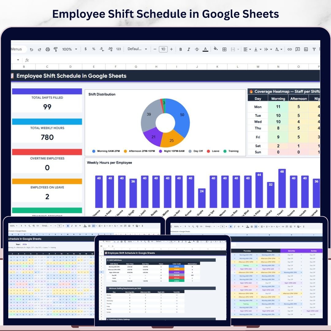 An Employee Shift Schedule in Google Sheets is a cloud-based spreadsheet template that helps managers assign, track, and visualize employee shifts across weekly and monthly views. It includes KPI cards, charts, an employee directory, and customizable settings for shift definitions and staffing policies.