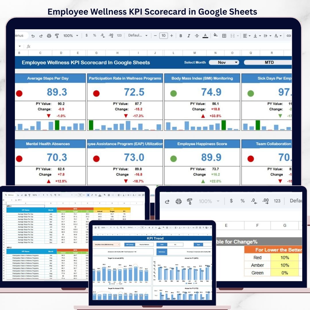 Organizations investing in employee wellness programs report 25% lower healthcare costs and 40% fewer sick days, according to multiple workplace health studies. Yet most HR teams still rely on scattered spreadsheets and manual tracking to measure the impact of their wellness initiatives. The Employee Wellness KPI Scorecard in Google Sheets changes that — it tracks 10+ wellness KPIs across 4 structured worksheets with MTD and YTD comparisons, trend charts, and conditional formatting indicators. Setup takes under 10 minutes, and the entire scorecard updates automatically when you enter new monthly data.