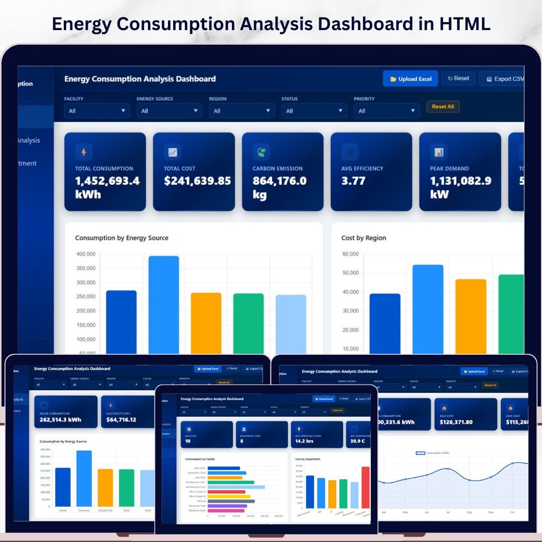 Energy Consumption Analysis Dashboard in HTML is a comprehensive, browser-based analytics solution built for energy managers, facility operators, sustainability officers, and operations teams who need to monitor energy consumption, costs, carbon emissions, and efficiency metrics — all from one sleek, interactive dashboard. This ready-to-use HTML dashboard template includes 5 interactive pages covering Overview, Energy Source Analysis, Facility and Department breakdown, Time Analysis, and a detailed Data View — giving you complete visibility into your organization’s energy footprint 🚀.
