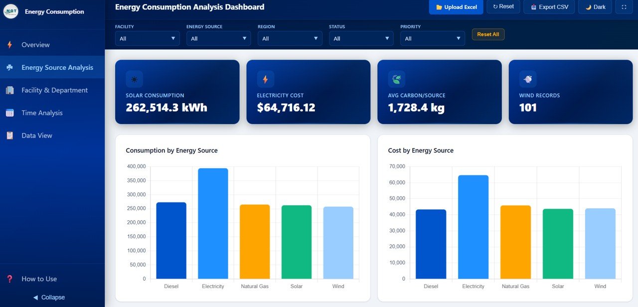 ⚡ 5 Interactive Dashboard Pages – Explore energy data across Overview, Energy Source Analysis, Facility and Department, Time Analysis, and Data View — each designed for a specific analytical perspective.