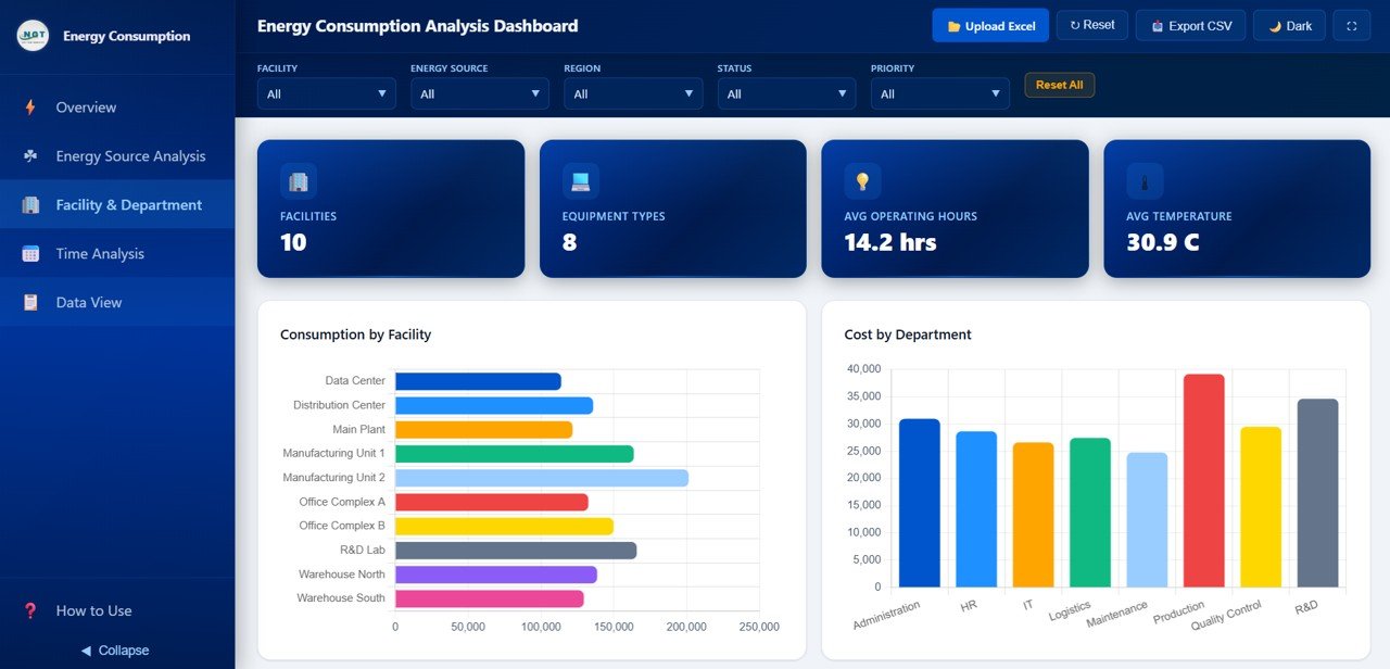 🏢 Facility and Department Breakdown – Compare consumption, costs, and emissions across facilities, departments, and equipment types for granular operational insights.