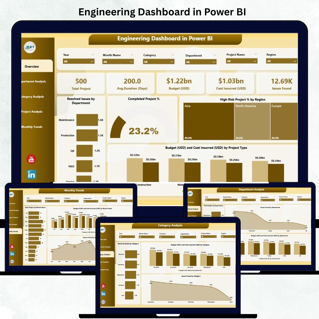 With five analytical pages covering departments, projects, categories, and monthly performance, this dashboard provides a 360° view of engineering operations, helping you streamline processes and enhance productivity.