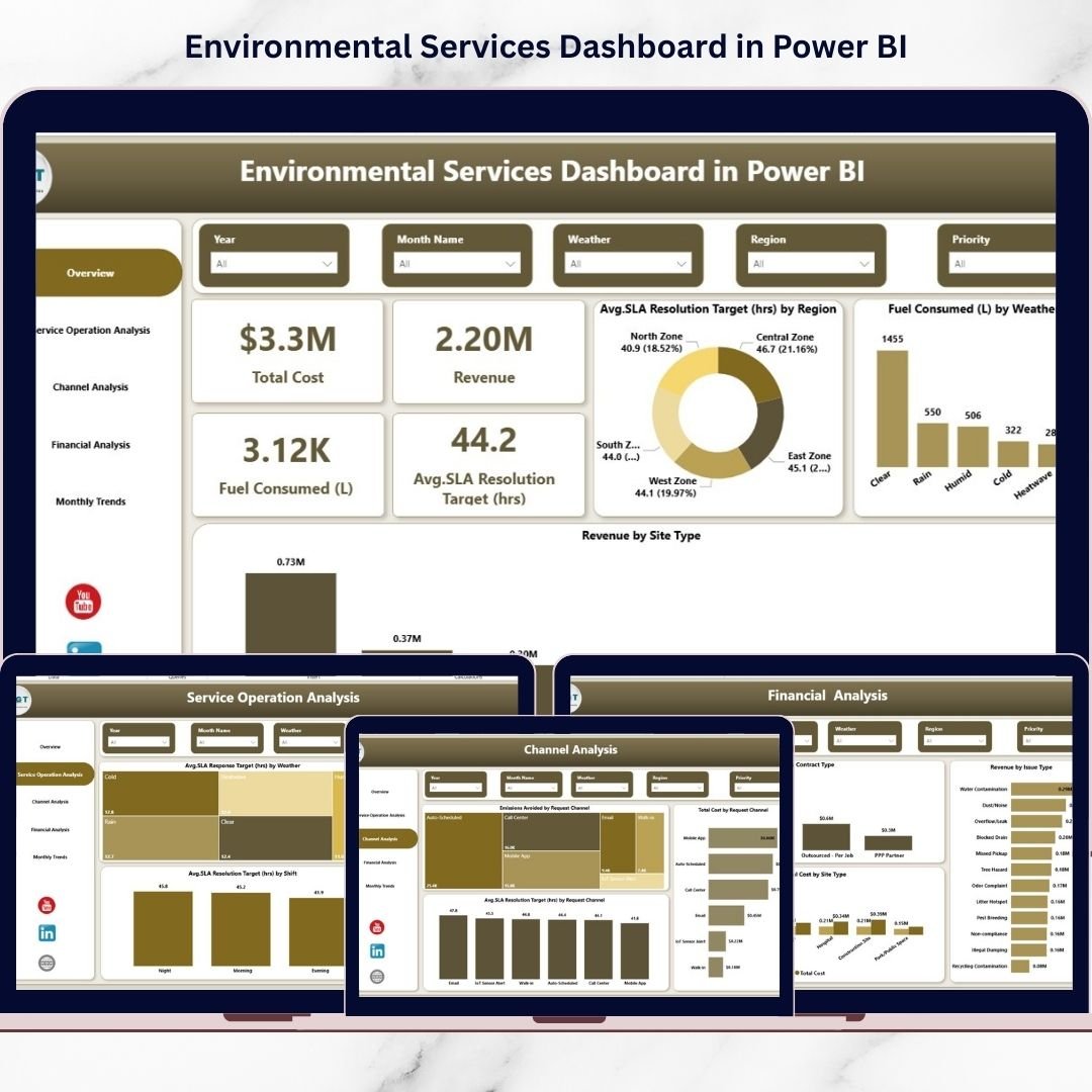 The Environmental Services Dashboard in Power BI is a powerful, ready-to-use analytics solution designed to transform complex environmental data into clear, interactive insights. Instead of spending hours compiling reports, organizations can instantly visualize performance, identify trends, and take action using a professional Power BI dashboard.