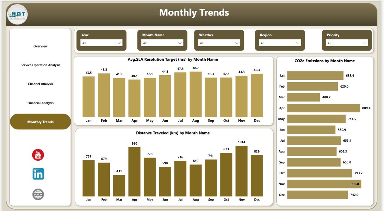 ⚡ Interactive Slicers & Filters – Analyze performance by region, weather condition, service channel, or time period.