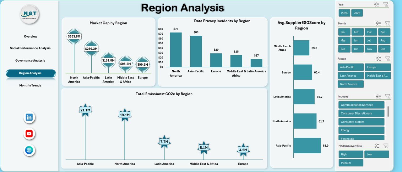 Highlights regional ESG performance, supplier ESG scores, emissions, and data privacy incidents.