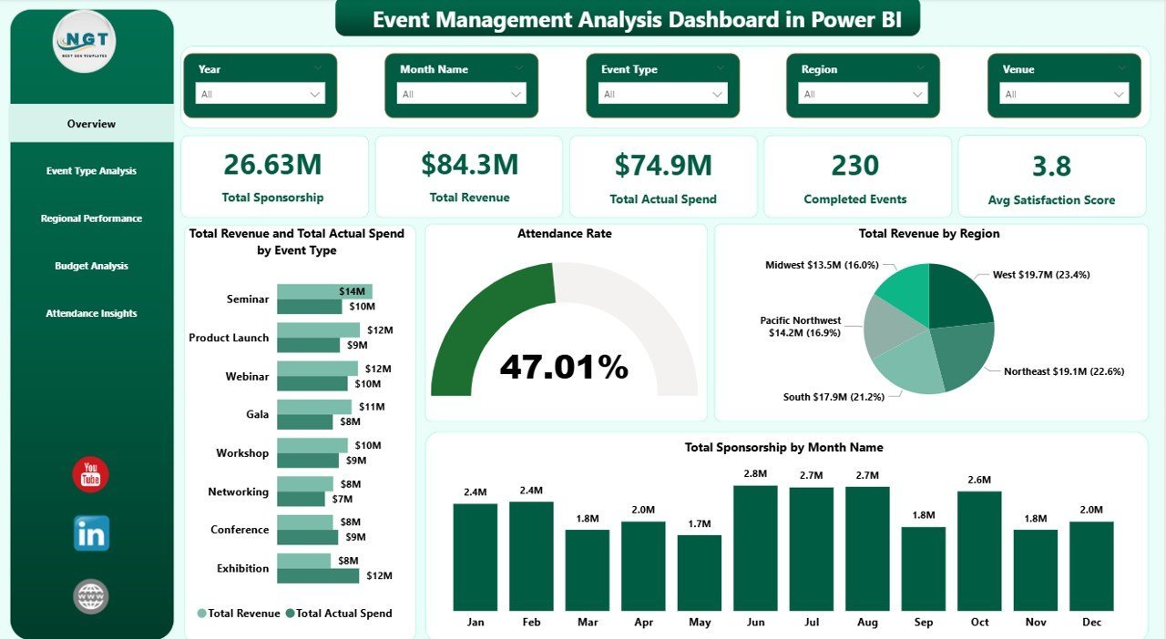 The Event Management Analysis Dashboard in Power BI tracks 5 headline KPIs on the Overview page — Total Sponsorship, Total Revenue, Total Actual Spend, Completed Events, and Avg Satisfaction Score — plus secondary metrics like Attendance Rate, Budget Utilization, and Total Tickets Sold across 4 analytical pages.
