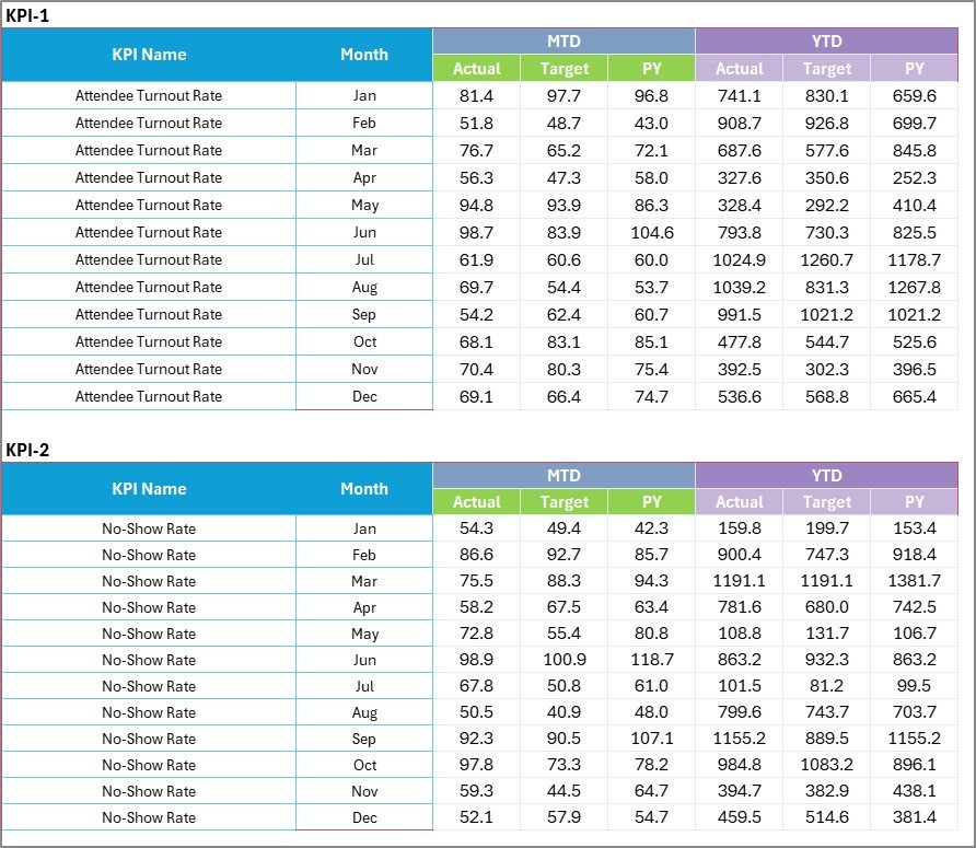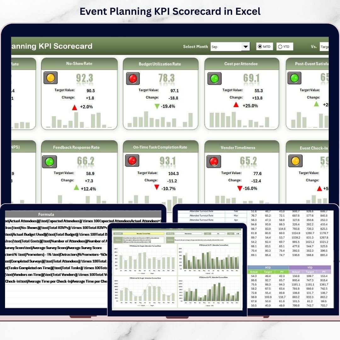 Event Planning KPI Scorecard in Excel This Excel-based scorecard allows you to track revenue, costs, attendee satisfaction, vendor performance, and marketing ROI — all in one organized and automated system.
