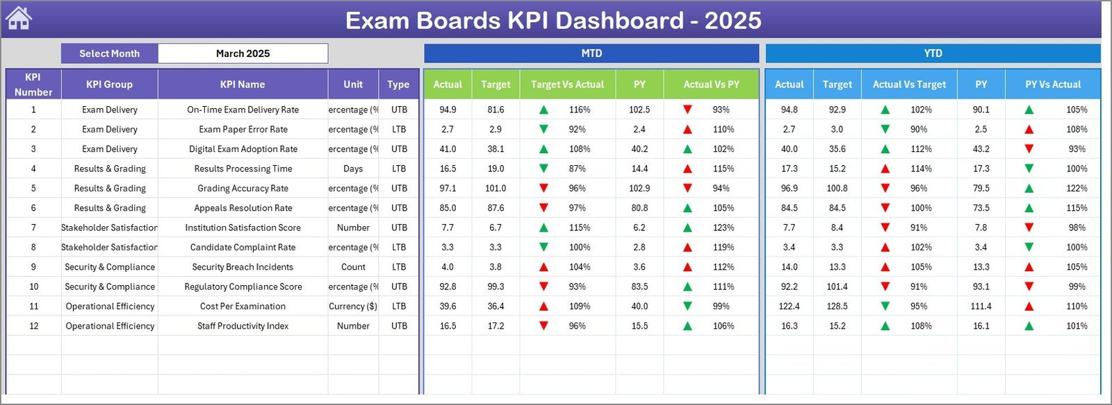 Yes. The Exam Boards KPI Dashboard in Excel shows MTD Actual, Target, and Previous Year alongside YTD Actual, Target, and Previous Year for every KPI. Variance arrows indicate whether each metric is above or below target.