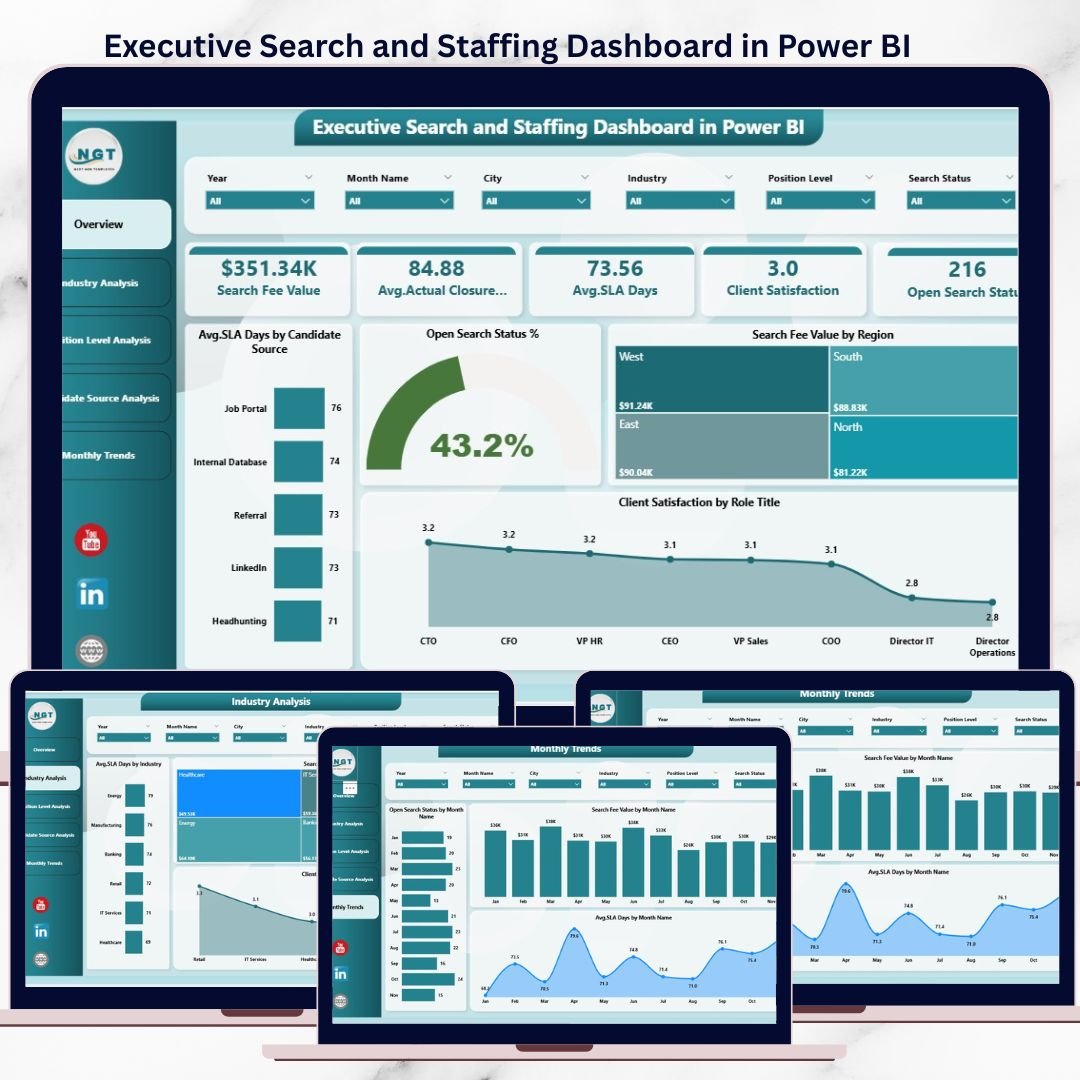 The Executive Search and Staffing Dashboard in Power BI is a ready-to-use, interactive analytics solution designed to give recruitment leaders real-time control and complete visibility over hiring performance.