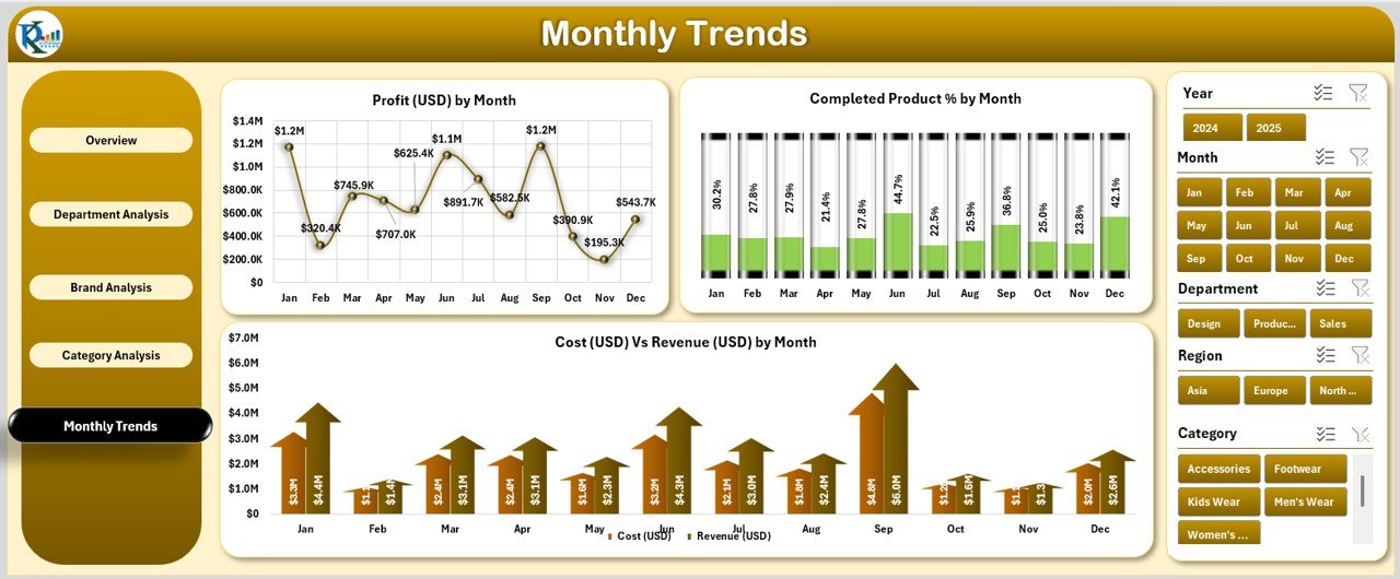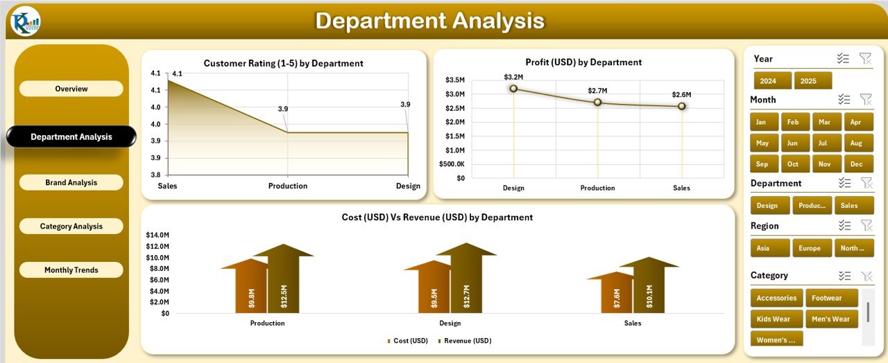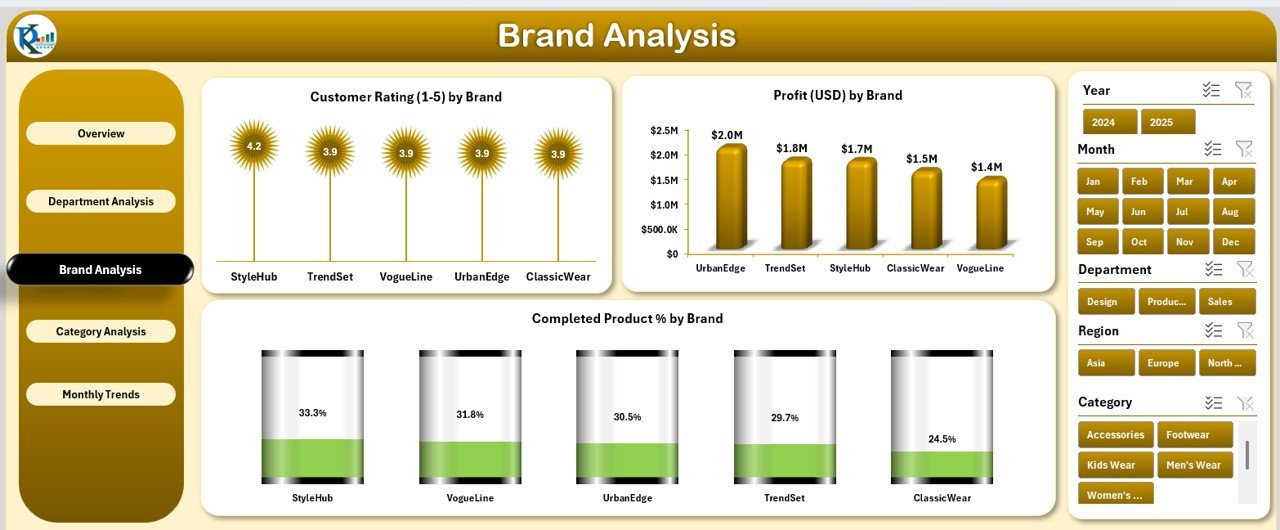Whether you manage a boutique clothing line or a global brand portfolio, this dashboard delivers an instant overview of your company’s performance across departments, brands, categories, and regions. No coding, no complicated setup — just plug in your data and watch Excel transform it into actionable insights.