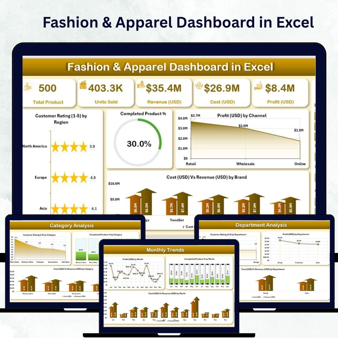 In the fast-moving world of fashion, staying ahead of trends while maintaining profitability is a constant challenge. The Fashion & Apparel Dashboard in Excel brings clarity, speed, and structure to your business decisions. Designed for retailers, designers, and apparel manufacturers, this ready-to-use Excel dashboard consolidates sales, profit, cost, and customer rating data into one visual, interactive file — making performance tracking effortless.