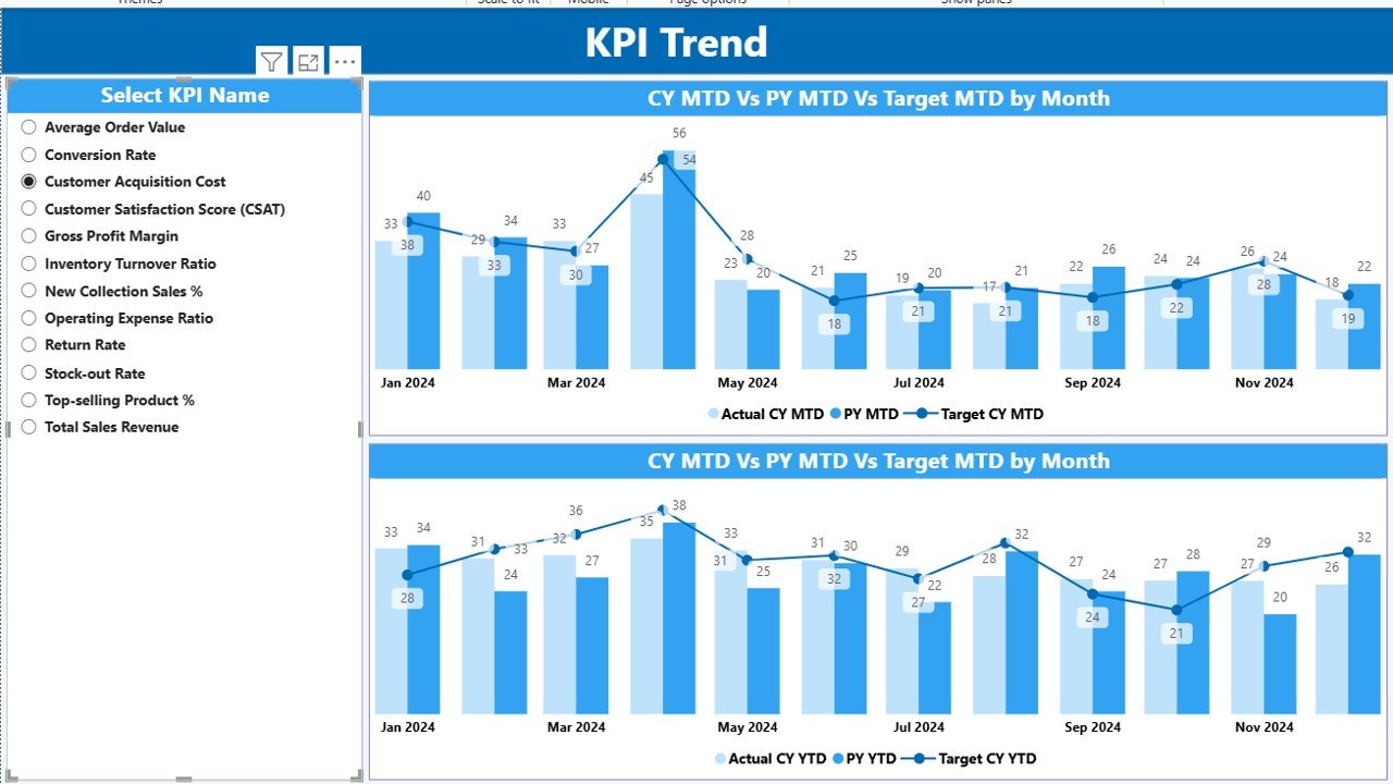 MTD Trend Chart showing Actual vs Target vs Previous Year.Fashion & Apparel KPI Dashboard in Power BI