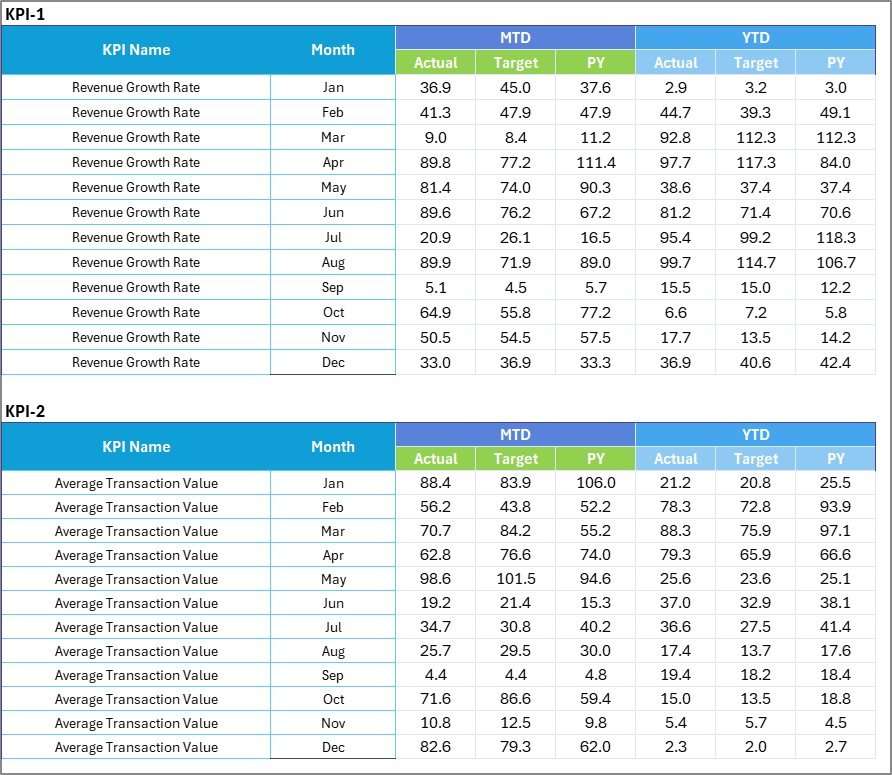 🎯 Actual vs Target Comparison – Instantly see whether each KPI meets expectations.