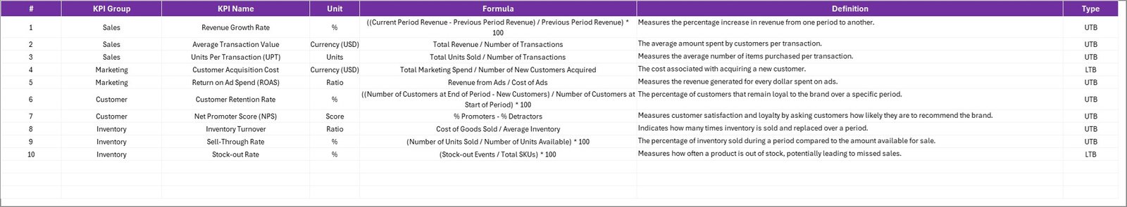 💡 Fully Customizable – Add or edit KPIs, formulas, and visuals to suit your brand’s operations.