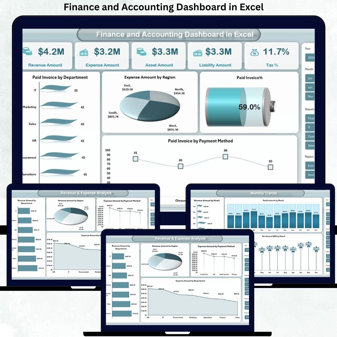 This ready-to-use Excel dashboard acts as a central command center for your finance and accounting operations. Instead of switching between multiple reports, you get real-time visibility into revenue, expenses, assets, liabilities, taxes, invoices, and monthly trends—all in one powerful Excel file.