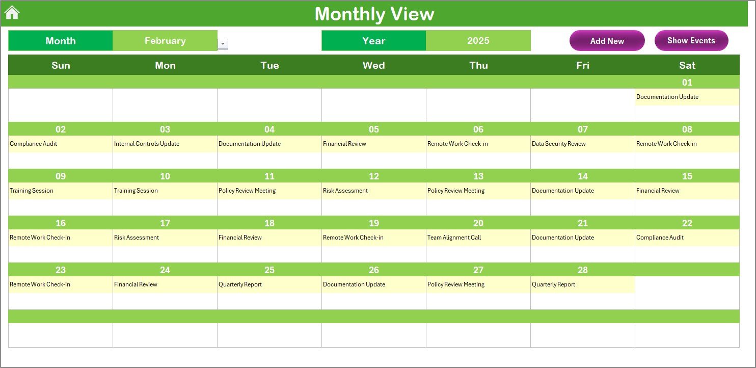 📊 Five Powerful Worksheets – Home, Annual View, Monthly View, Daily View, and Events database.