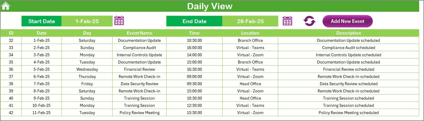 📆 Daily View – Enter date ranges to track detailed compliance activities such as audits or tax filings.