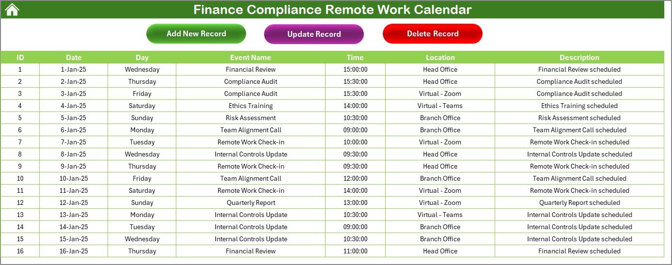 The Finance Compliance Remote Work Calendar in Excel comes pre-built with:
