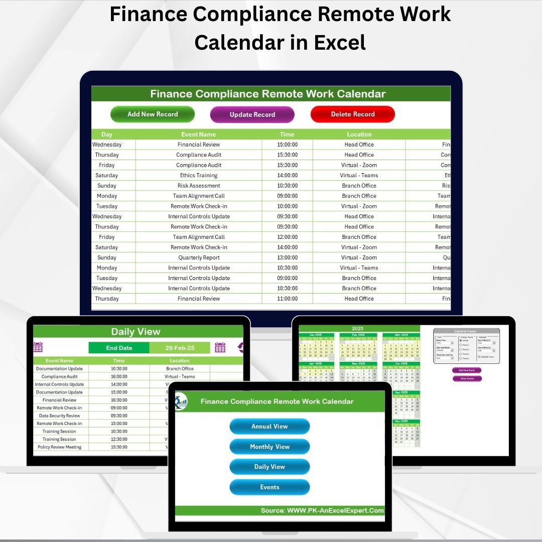 That’s exactly what the Finance Compliance Remote Work Calendar in Excel delivers. This ready-to-use calendar template offers a centralized, automated, and easy-to-navigate solution that ensures your finance and compliance teams never miss a task again.
