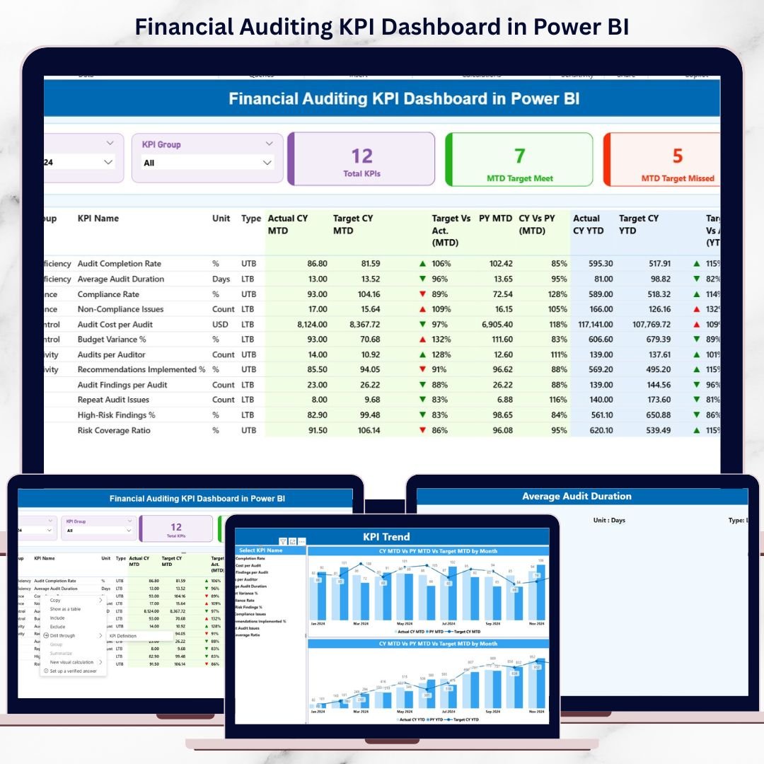 This ready-to-use Power BI dashboard transforms raw financial audit data into clear KPIs, interactive visuals, and actionable insights. Instead of reviewing lengthy audit reports, auditors can instantly track MTD and YTD performance, target vs actual results, and year-over-year trends from a single dashboard. Consequently, audit teams save time, improve accuracy, and build stronger confidence with stakeholders.