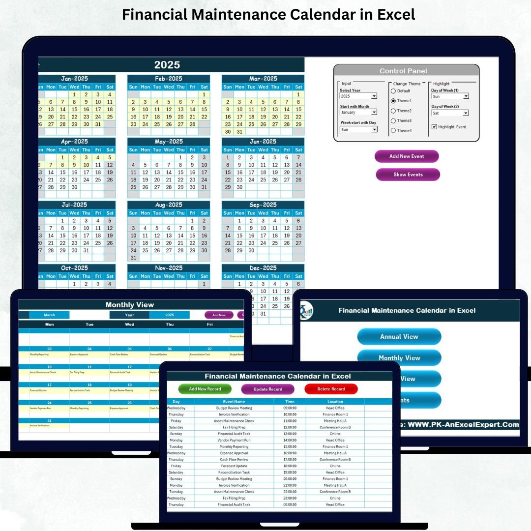 Managing financial tasks across multiple emails, notes, and spreadsheets often leads to missed deadlines and last-minute stress. The Financial Maintenance Calendar in Excel solves this problem by giving you a smart, organized, and fully automated system to track all financial activities in one place. This ready-to-use calendar helps you plan, monitor, and manage your financial workflow with complete clarity—whether you handle personal finance or business operations.Financial Maintenance Calendar in Excel.