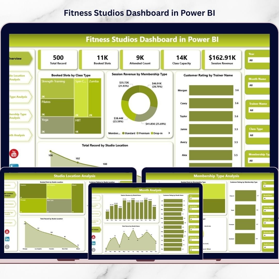This ready-to-use dashboard provides a centralized analytics platform where studio owners and managers can monitor performance, compare locations, analyze class popularity, evaluate trainers, and track monthly trends — all in one place. Instead of guessing, you make confident decisions backed by real data.