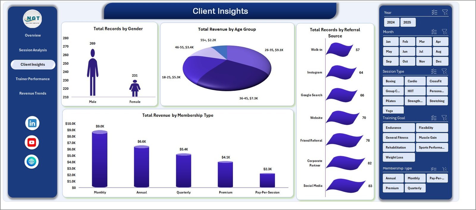 🔹 Client Segmentation Built In — analyze revenue and session volume by age group, gender, referral source, and membership type to find your most profitable client segment.