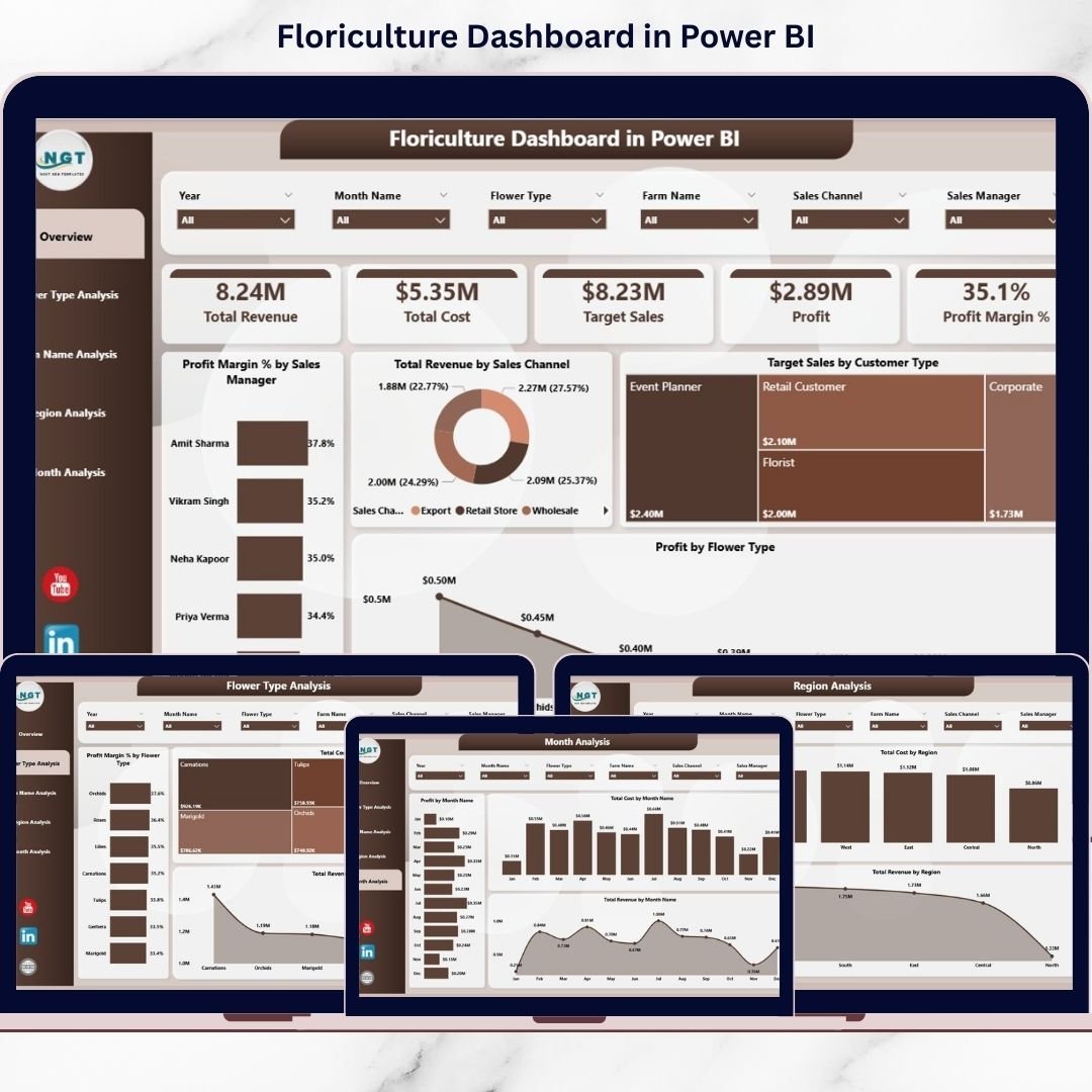 Now imagine tracking Total Revenue, Profit Margin %, Target Sales, Flower Type performance, Farm contribution, Region-wise results, and Monthly trends — all in one powerful interactive system.