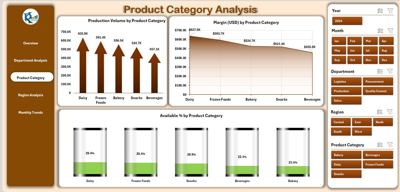 🍴 Product Category Analysis – Drill down into category-level production, availability, and profitability.