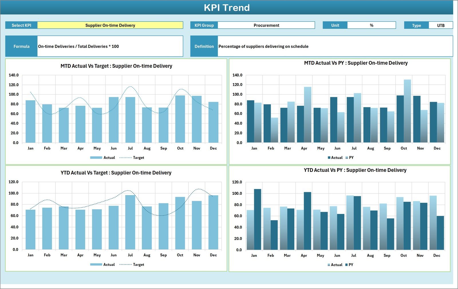 The KPI Trend Sheet lets you select any KPI from a dropdown menu to examine its trends over time, including MTD and YTD charts for actual, target, and prior year (PY) data. You’ll also find detailed KPI metadata such as KPI Group, Unit, Type (whether lower or upper is better), formula, and definition, ensuring you fully understand each metric’s impact.