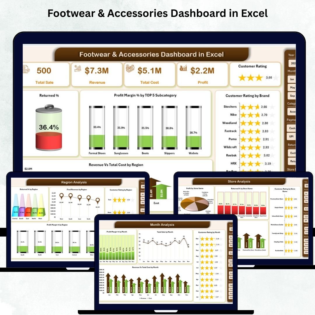 Unlock the power of smart retail analytics with the Footwear & Accessories Dashboard in Excel! Get instant insights into sales, costs, returns, ratings, and store performance—all in one beautiful, interactive dashboard. Perfect for retail owners, store managers, and category teams.