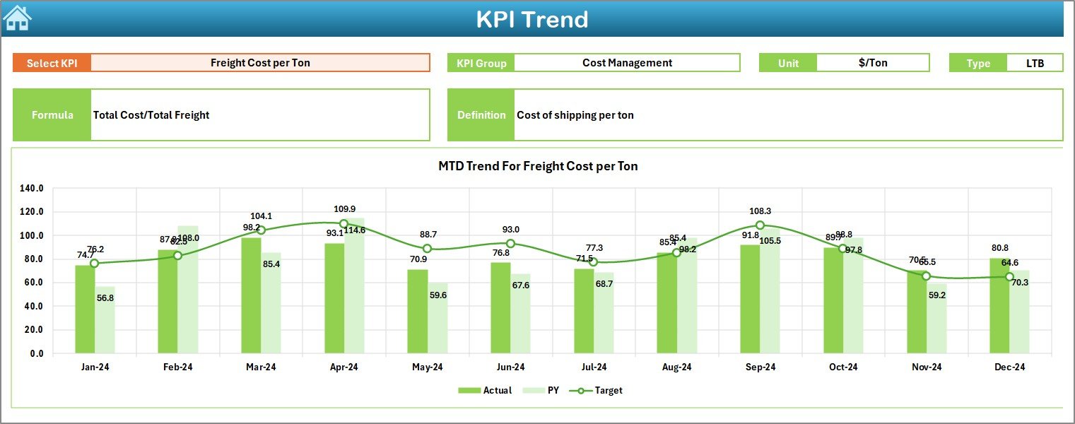 Dive deeper into each KPI’s movement over time. Select a KPI from the dropdown to see trend charts, KPI definitions, and unit of measurement. Perfect for identifying improvement opportunities.Freight Tracking KPI Dashboard in Excel