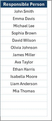 2️⃣ List Sheet – A clean list of responsible persons to keep assignments consistent via dropdown menus.