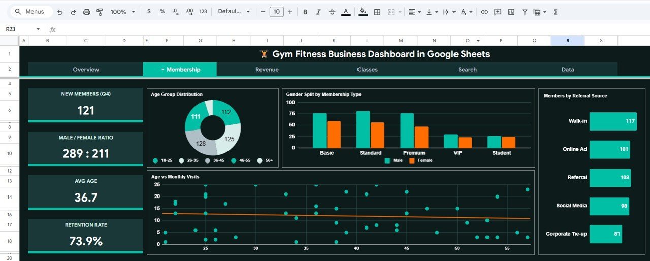 🔹 Membership Analysis – Tracks New Members (Q4), Male/Female Ratio, Avg Age, Retention Rate with charts for Age Group Distribution, Gender Split by Membership Type, Age vs Monthly Visits, and Members by Referral Source.
