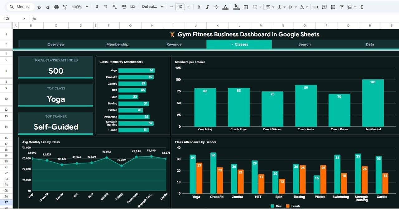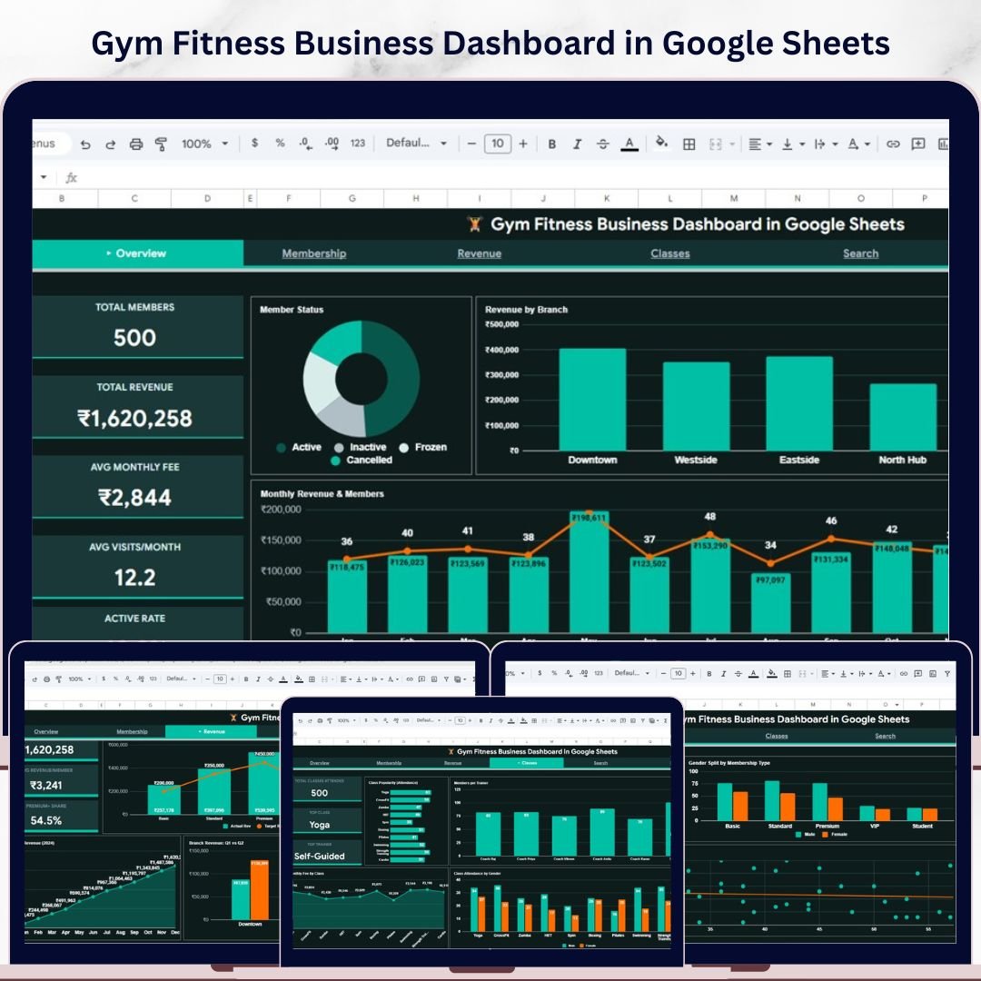The Gym Fitness Business Dashboard in Google Sheets is a powerful, ready-to-use analytics template built for gym owners, fitness center managers, and personal training studios who want complete visibility into their business performance. This dashboard includes 6 interactive sheet tabs covering membership tracking, revenue analysis, class attendance, trainer performance, and member search — all powered by Google Sheets formulas and charts that update automatically when you enter your data.