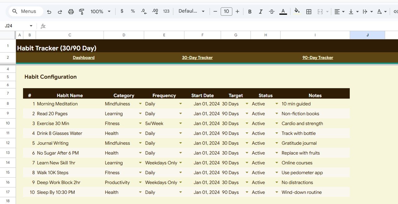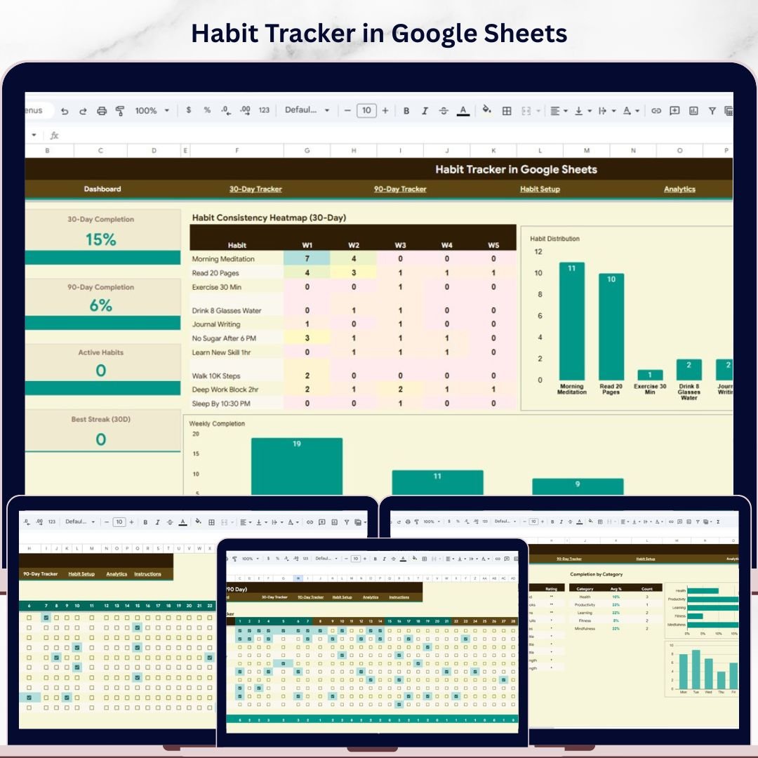 📊 Habit Tracker in Google Sheets is your ultimate personal productivity companion designed to help you build, monitor, and sustain daily habits over 30-day and 90-day cycles. Whether you are trying to exercise regularly, read daily, meditate, drink more water, or develop any positive routine — this ready-to-use Google Sheets Tracker Template gives you complete visibility into your habit consistency, streaks, and completion rates — all in one beautifully organized spreadsheet.