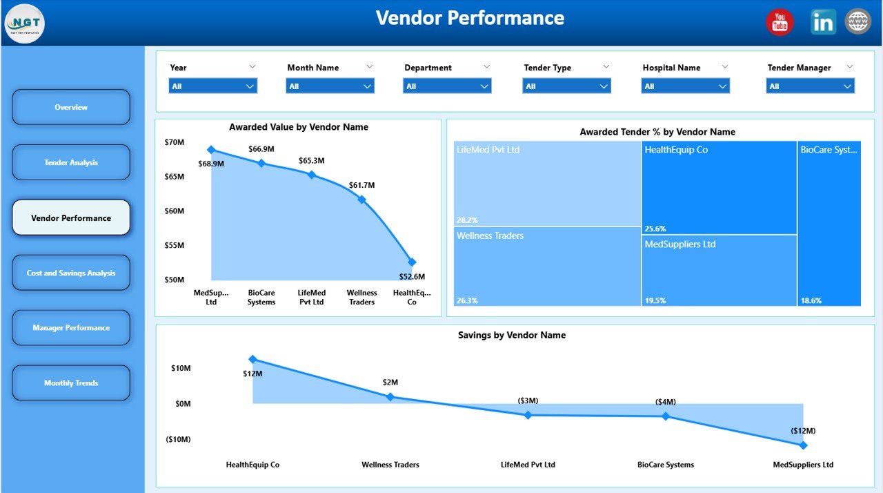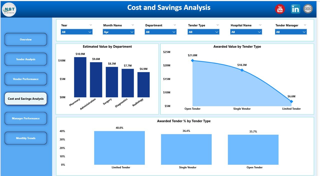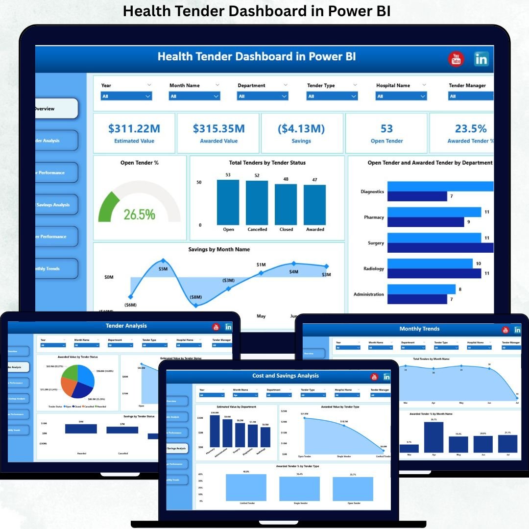 This ready-to-use Power BI dashboard transforms raw healthcare tender data into clear, interactive, and decision-ready insights. Instead of manually reviewing tender lists and reports, healthcare leaders gain instant visibility into estimated value, awarded value, savings, open tenders, vendor performance, manager efficiency, and monthly trends—all from one centralized dashboard.