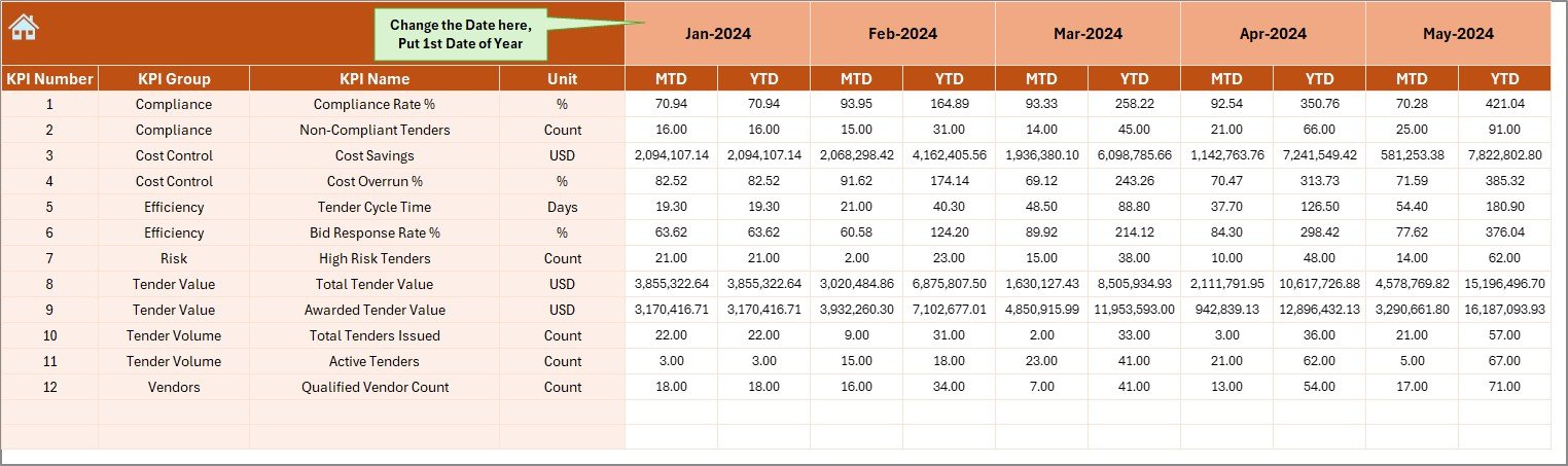 1️⃣ Enter actual tender performance data in the Actual Numbers sheet