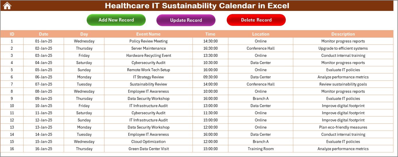 5️⃣ Events Sheet: The data engine of your calendar — stores all events, updates automatically, and supports editing or deleting records.Healthcare IT Sustainability Calendar in Excel